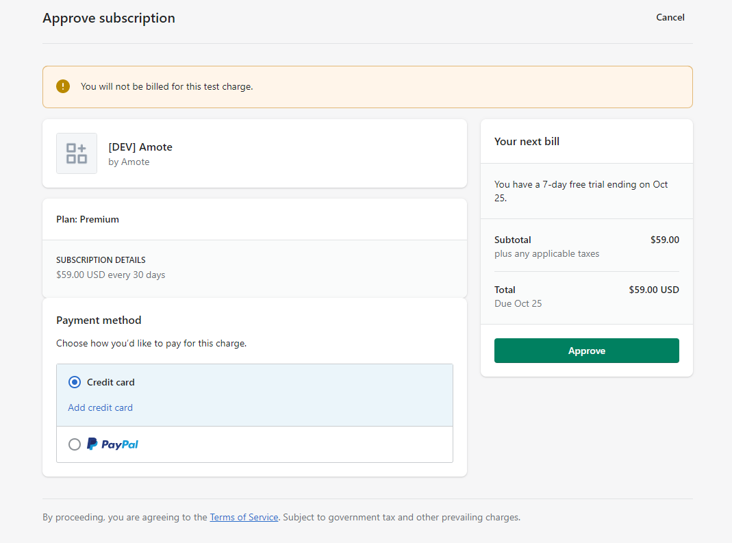 You will be routed to the Shopify Approve charge page that will show you full information with an exact date when you will be charged as the below example:
