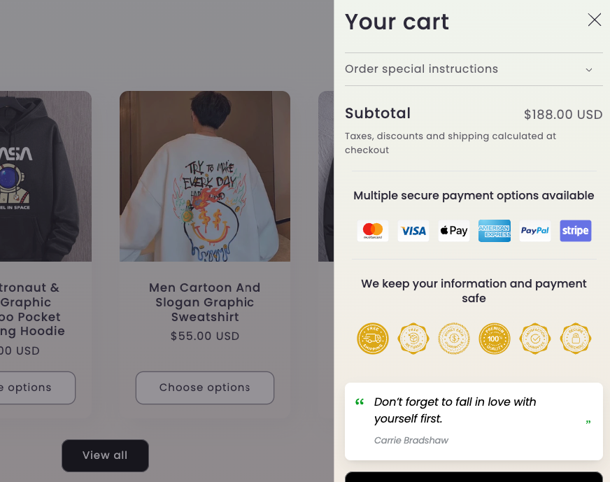 A Cart Drawer is a cart type provided by Shopify that opens as a slide‑out panel on the same page when customers add products to their cart.