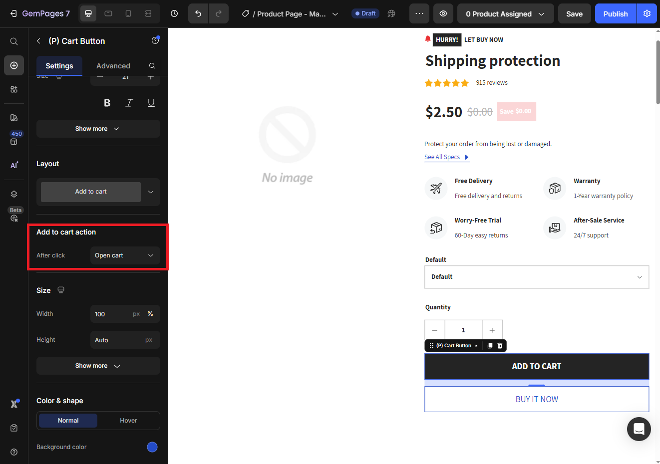 If you use any of Shopify page builder apps like GemPages or PageFly, make sure that the Add to Cart action is set to Open cart in their template editor: