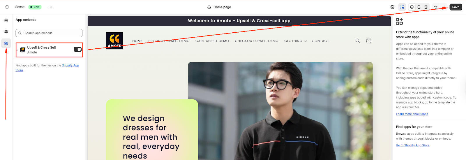 Open App embeds from the left sidebar → Toggle Amote ON → Click Save: