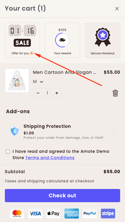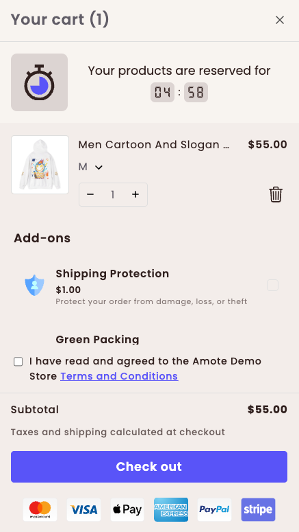 When a customer adds a product to the cart, the countdown timer is automatically triggered. It displays a live ticking clock that shows customers how much time they have left to complete their purchase (for example during a flash sale or limited-time offer). This helps create urgency and can boost conversions directly inside the cart drawer.