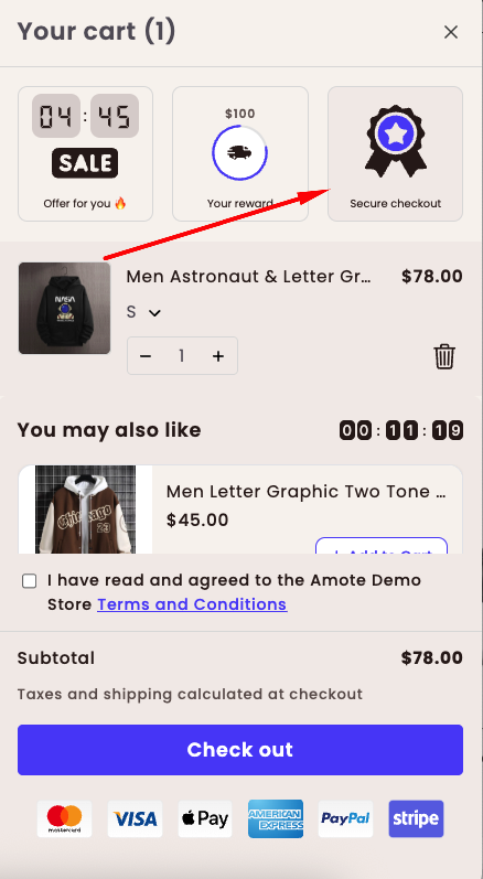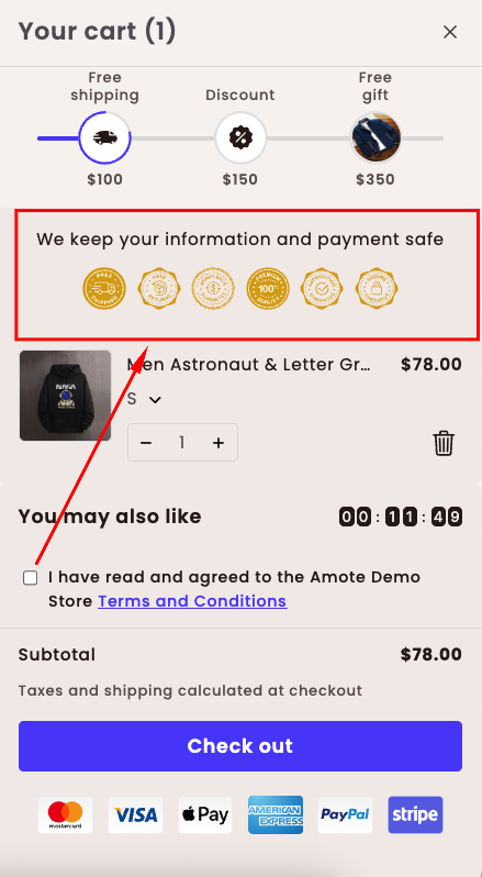 Trust Badges help build customer confidence before checkout by highlighting key trust signals such as secure payments, fast shipping, and buyer protection. Displaying these badges inside the cart drawer reassures customers and helps reduce cart abandonment.