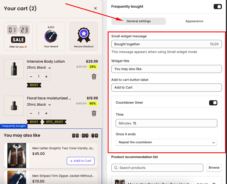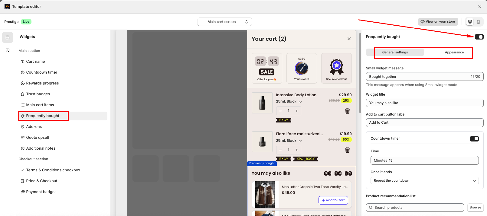 In General Settings, configure the content and behavior of the Frequently Bought section:
