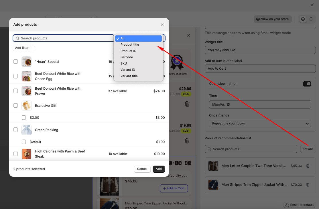 - Product recommendation list: Select which products to display in the Frequently Bought section. You can also filter products by Categories, Collection, Tags, Types or Vendors.