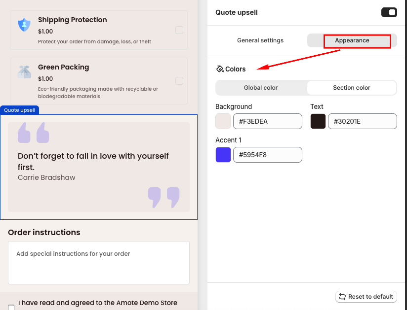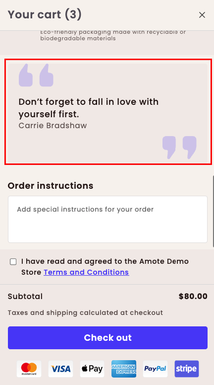 Quote Upsell allow you to inspire trust by displaying short messages, testimonials, or reassuring statements directly inside the cart drawer. It helps customers feel more confident and encourages them to complete checkout.