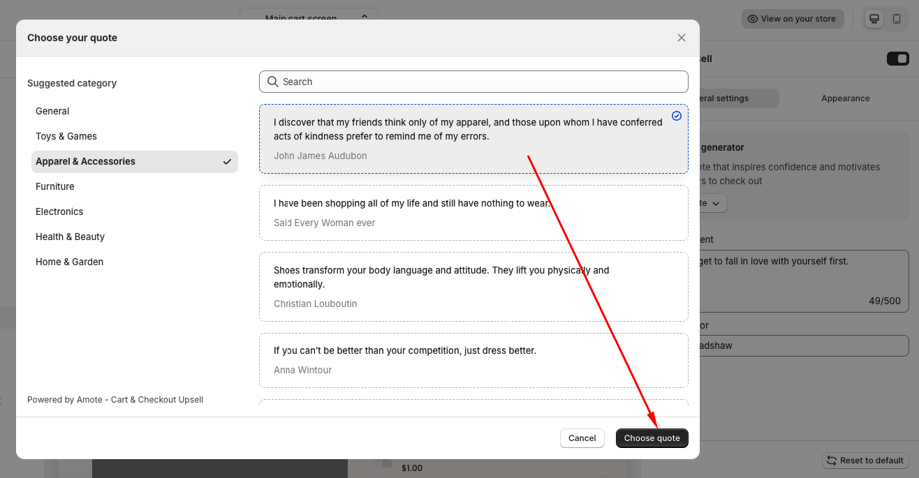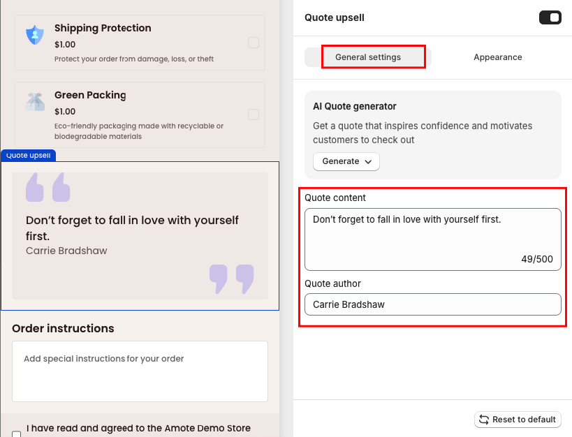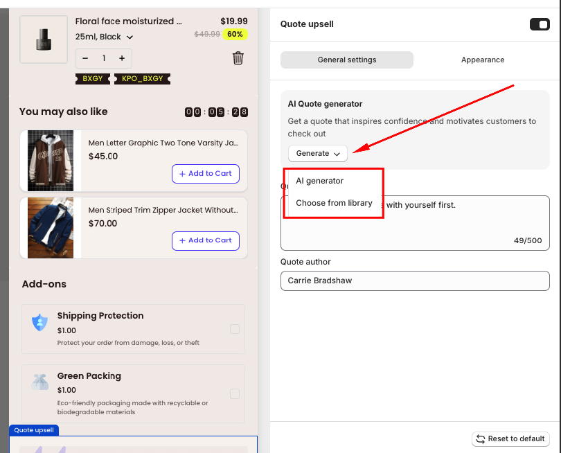 In General Settings, set up your quote content using the AI Quote Generator or Choose from library: