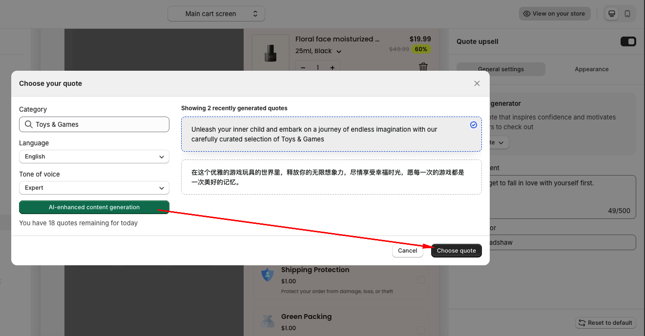 (1) AI Quote Generator: Use the built-in AI tool to generate professional quotes that match your brand. You can select the Category, Language, and Tone of voice to fit your store style.