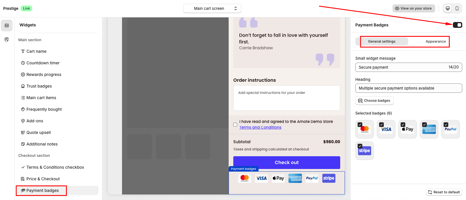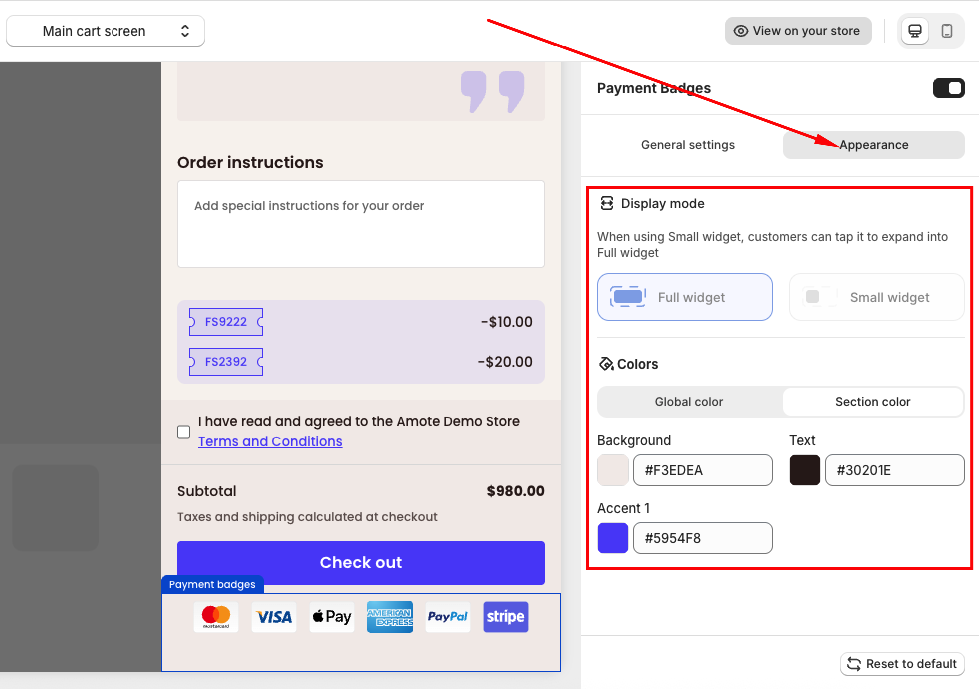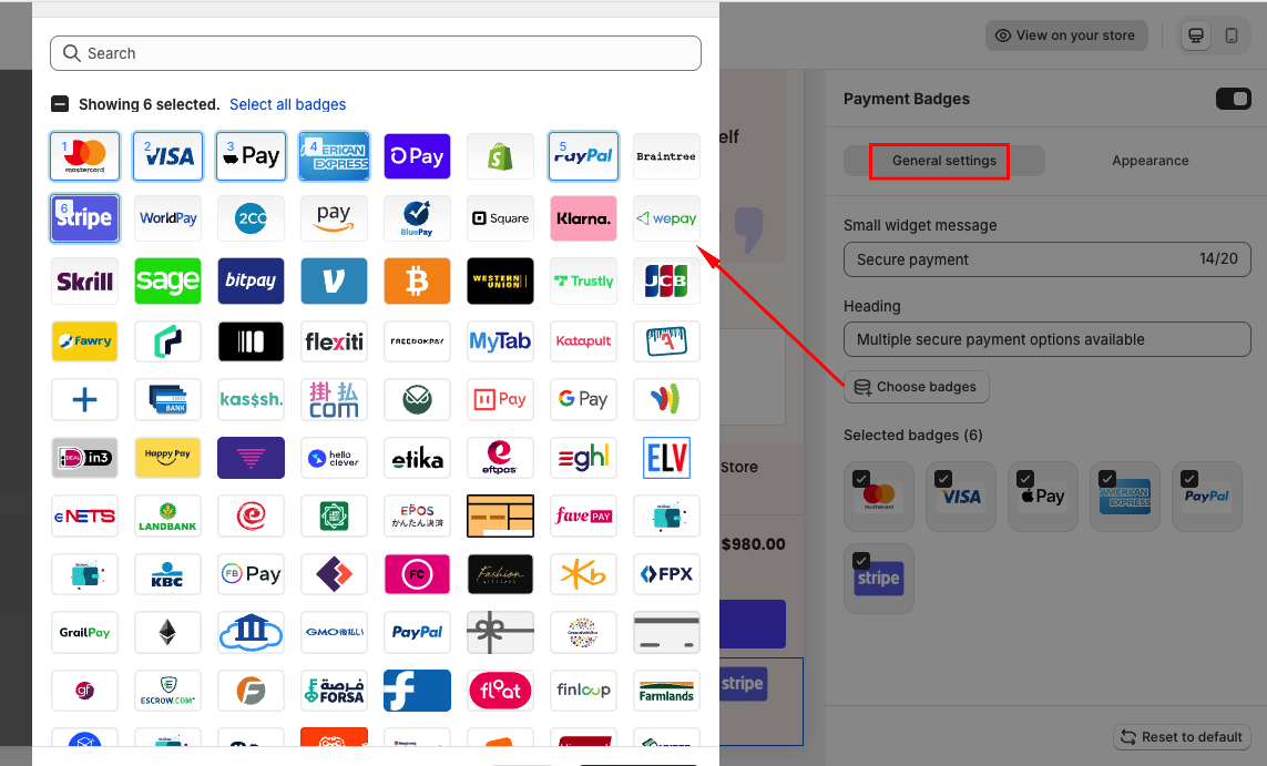 Choose badges: Select the payment method icons you want to display (for example: Visa, Mastercard, PayPal, Apple Pay, etc.)