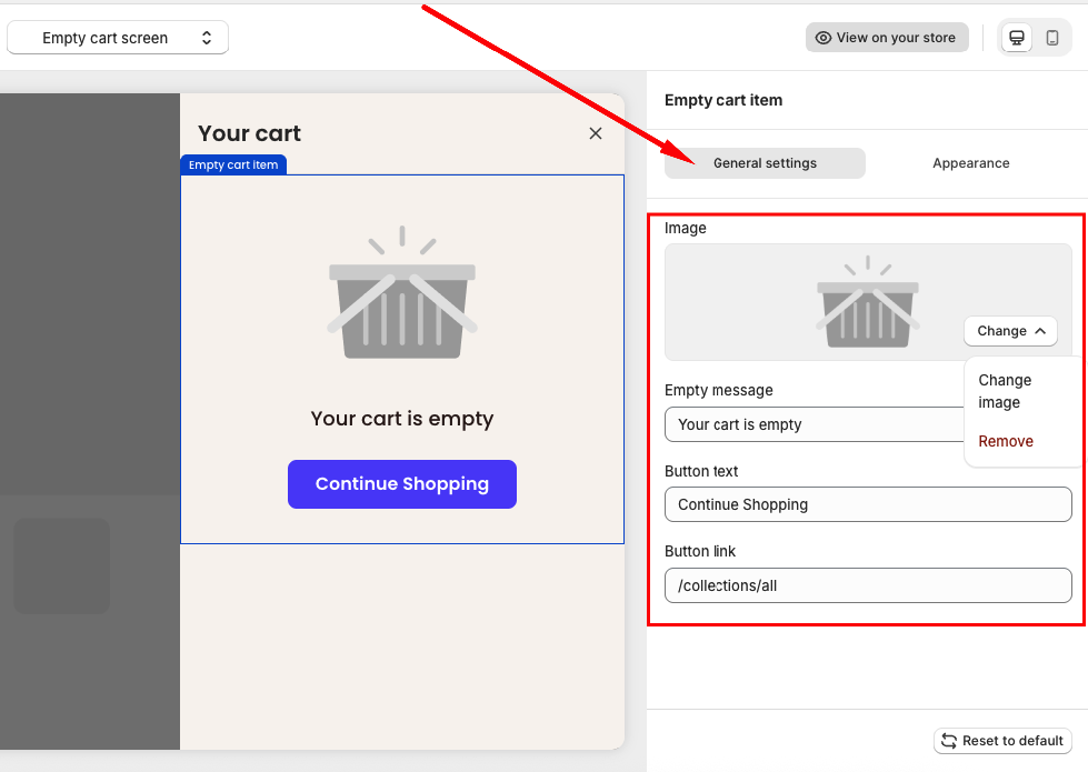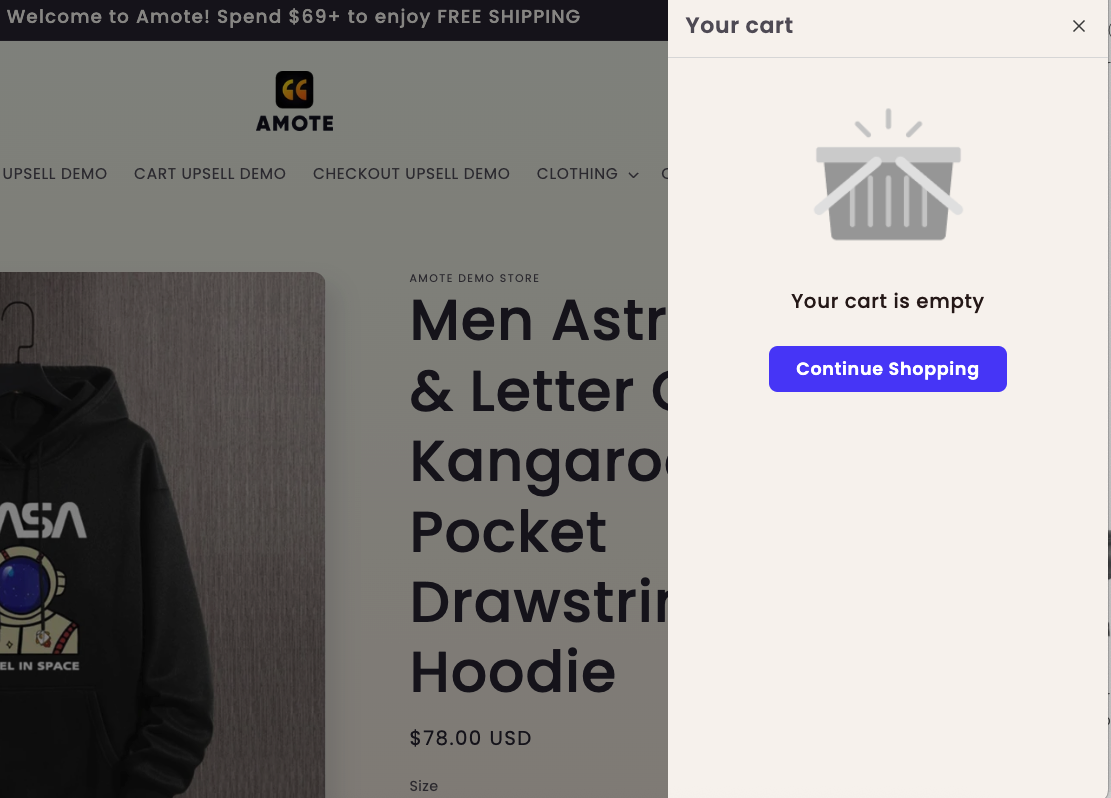 Wondering how your cart drawer looks when there are no items inside? This feature allows you to customize the empty cart state by displaying a friendly message, image, and call-to-action to guide customers back to shopping.